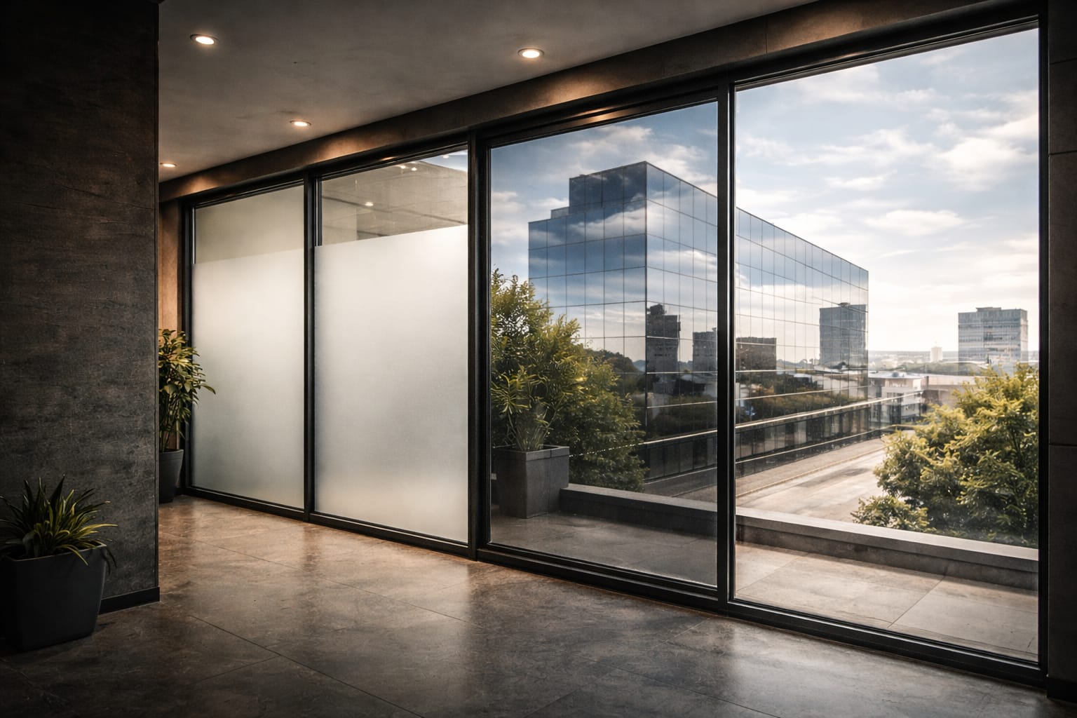Professionelle Fensterfolien in Hamburg für Sichtschutz und Sonnenschutz. Milchglasfolie für Privatsphäre und Spiegelfolie gegen Hitze für moderne Bürogebäude.